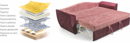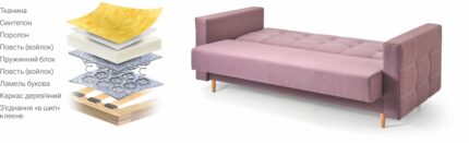 | • Декоративні (фігурні) МДФ накладки на бильцях. • Одна містка ніша для білизни. | • Дві великі подушки. • Декоративна відстрочка швівна подушках. |