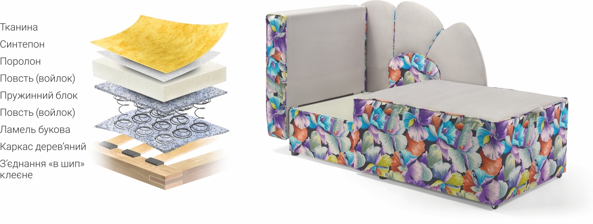 | • М’яке бильце. • Одна містка ніша для білизни. | • Одна маленька подушка. • Фігурна спинка. |